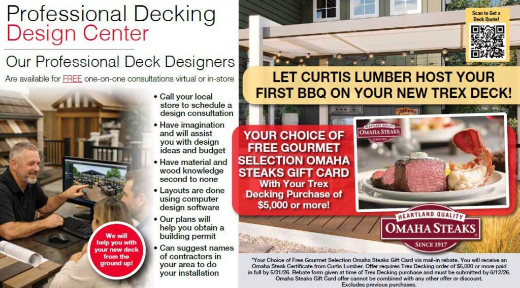 *Your Choice of Free Gourmet Selection Omaha Steaks Gift Card via mail-in rebate. You will receive an Omaha Steak Certificate from Curtis Lumber. Offer requires Trex Decking order of $5,000 or more paid in full by 5/31/26. Rebate form given at time of Trex Decking purchase and must be submitted by 6/12/26. Omaha Steaks Gift Card offer cannot be combined with any other offer or discount. Excludes previous purchases.
